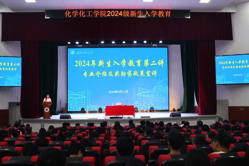 为帮助新生了解自己的专业以及未来发展方向,尽快适应大学的学习生活,合理、科学地规划未来的学习生涯,9月12日下午,我们于湖师大礼堂为化学、应用化学、化学工程与工艺三个专业新生进行专业介绍。化学专业负责人陈金阳副教授、应用化学专业负责人郑春阳副教授、化学工程与工艺专业负责人周耀副教授担任主讲人,我们学生会(学生自律委员会)主席肖丹及院团委学生副书记陈伯骏担任主持人,我们2024级全体新生参加。