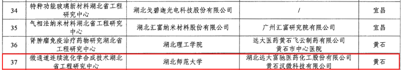 近日,湖北省发展和改革委员会印发《关于公布2024年湖北省工程研究中心认定名单的通知》(鄂发改高技〔2024〕357号),我们作为主要依托单位,与湖北远大富驰医药化工股份有限公司、黄石汉微科技有限公司联合申报的“微通道连续流化学合成技术湖北省工程研究中心”正式获批建设。