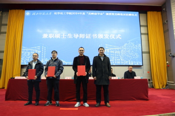院长殷国栋代表学院及全体受助学生,将致信美峰集团合集《感恩有你》回赠美峰集团。余涛为湖北美峰技术有限公司总经理曾诚、黄冈美丰化工科技有限公司总经理刘建军、黄冈美丰化工科技有限公司副总经理徐文立等三位高管颁发兼职硕士生导师聘书并合影留念。