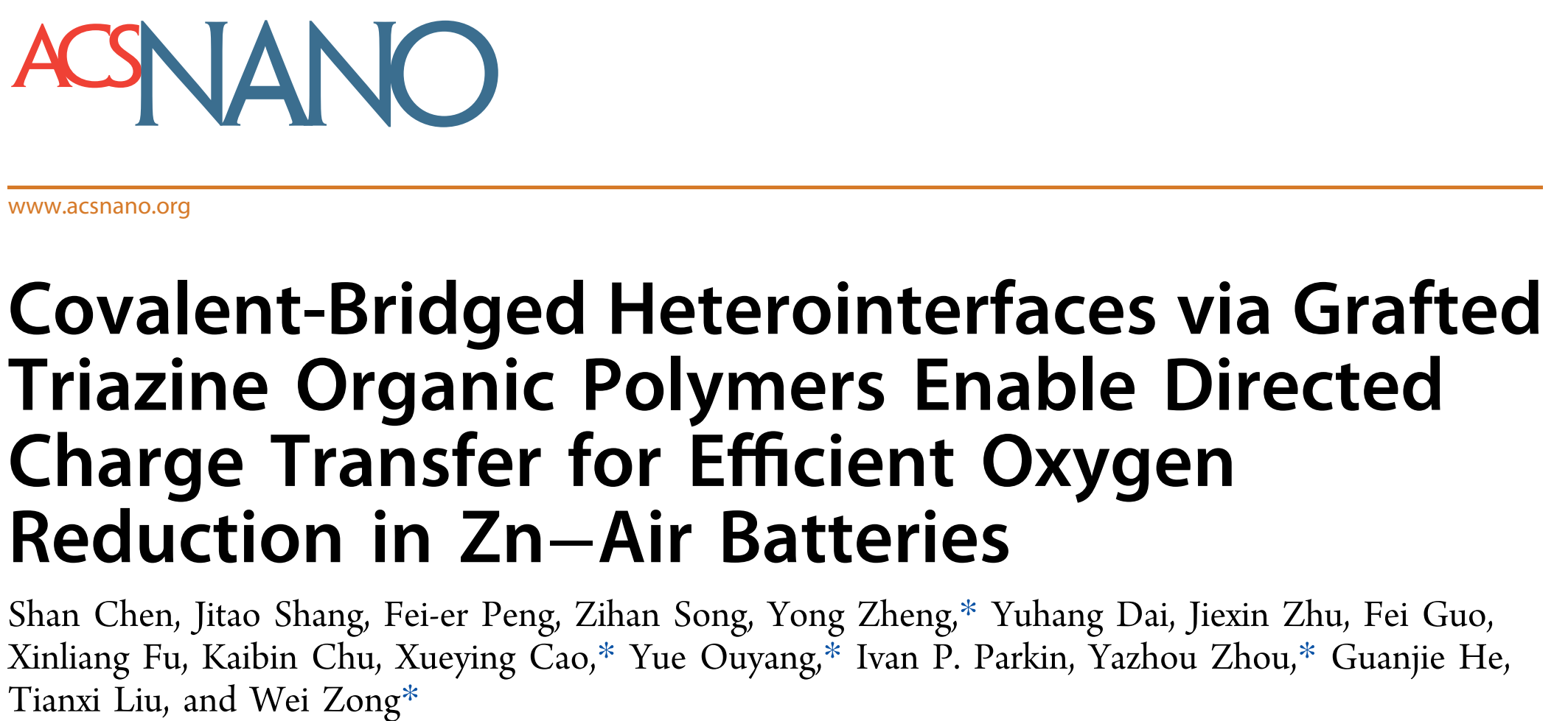 近日,国际知名期刊ACS Nano(《美国化学学会—纳米》)在线发表了物理化学教研室陈山博士团队在电催化氧还原(ORR)领域的最新研究成果。论文题为“Covalent–Bridged Heterointerfaces via Grafted Triazine Organic Polymers Enable Directed Charge Transfer for Efficient Oxygen Reduction in Zn–Air Batteries”(共价桥连异质界面增强氧还原反应电子定向转移用于锌-空气电池)。陈山博士为论文第一作者,三峡大学郑勇博士、临沂大学曹雪莹博士、英国伦敦大学学院欧阳玥博士、德国马克斯普朗克聚合物研究所周亚洲博士和牛津大学宗伟博士为论文共同通讯作者,williamhill官网为论文第一通讯单位。ACS Nano是American Chemical Society(美国化学学会)出版社旗下材料科学领域TOP期刊、SCI中科院大类一区,最新影响因子为16.0。
