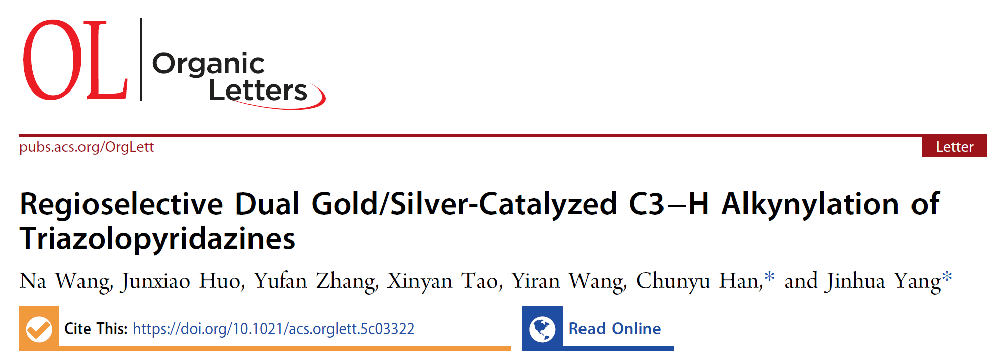 近日,国际知名期刊Organic Letters(《有机化学通讯》)在线发表了有机化学教研室韩春雨博士和杨进华副教授团队在金催化领域的最新研究成果。论文题目为“Regioselective Dual Gold/Silver-Catalyzed C3-H Alkynylation of Tri-azolopyridazines”(区域选择性金/银催化三唑并哒嗪的C3-H炔基化反应)。2024级硕士研究生王娜为论文第一作者,韩春雨博士为第一通讯作者,杨进华副教授为共同通讯作者,williamhill官网为论文唯一通讯单位。Organic Letters是American Chemical Society(美国化学会)出版社1999年起发行的国际期刊,主要报道有机化学方面的最新研究进展,是中科院一区top期刊、自然指数(Nature Index)期刊,最新影响因子为5.0。