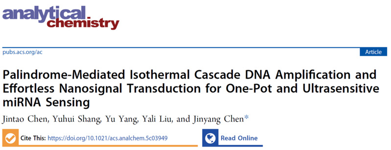 9月,Analytical Chemistry(《分析化学》)在线发表该团队研究成果,论文题为“Palindrome-Mediated Isothermal Cascade DNA Amplification and Effortless Nano-Signal Transduction for One-Pot and Ultrasensitive miRNA Sensing”(《回文介导等温级联DNA扩增与便捷纳米信号转导的miRNA超灵敏一锅法检测》)。我们2022级硕士研究生陈金涛为论文第一作者,陈金阳副教授为论文唯一通讯作者,williamhill官网为论文唯一通讯单位。Analytical Chemistry是American Chemical Society(美国化学会)出版社旗下分析化学领域顶级期刊,中科院SCI化学大类一区TOP期刊、自然指数期刊,最新影响因子为6.7。