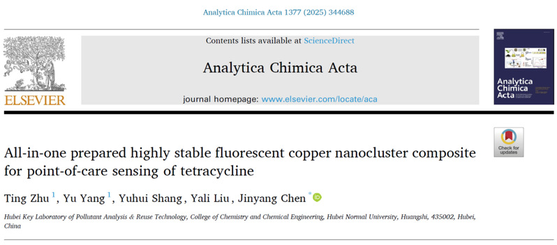 近日,Analytica Chimica Acta(《分析化学学报》)在线发表该团队研究成果,论文题为“All-in-one prepared highly stable fluorescent copper nanocluster composite for point-of-care sensing of tetracycline”(《一体化制备高稳荧光铜纳米簇复合材料用于四环素即时检测》)。我们2021级硕士研究生朱婷和2023级硕士研究生杨雨为论文共同第一作者,陈金阳副教授为论文唯一通讯作者,williamhill官网为论文唯一通讯单位。