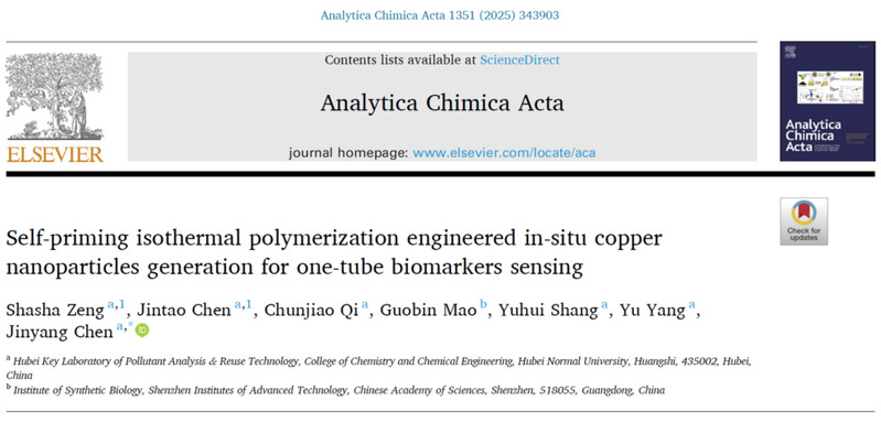 5月,Analytica Chimica Acta(《分析化学学报》)在线发表该团队研究成果,论文题为“Self-priming isothermal polymerization engineered in-situ copper nanoparticles generation for one-tube biomarkers sensing”(《自引发等温聚合调控铜纳米粒原位生成的一管式生物标志物检测》)。我们2021级硕士研究生曾莎莎和2022级硕士研究生陈金涛为论文共同第一作者,陈金阳副教授为论文唯一通讯作者,williamhill官网为论文唯一通讯单位。Analytica Chimica Acta是Elsevier出版社旗下分析化学领域知名期刊、中科院SCI化学大类二区TOP期刊,最新影响因子为6.0。