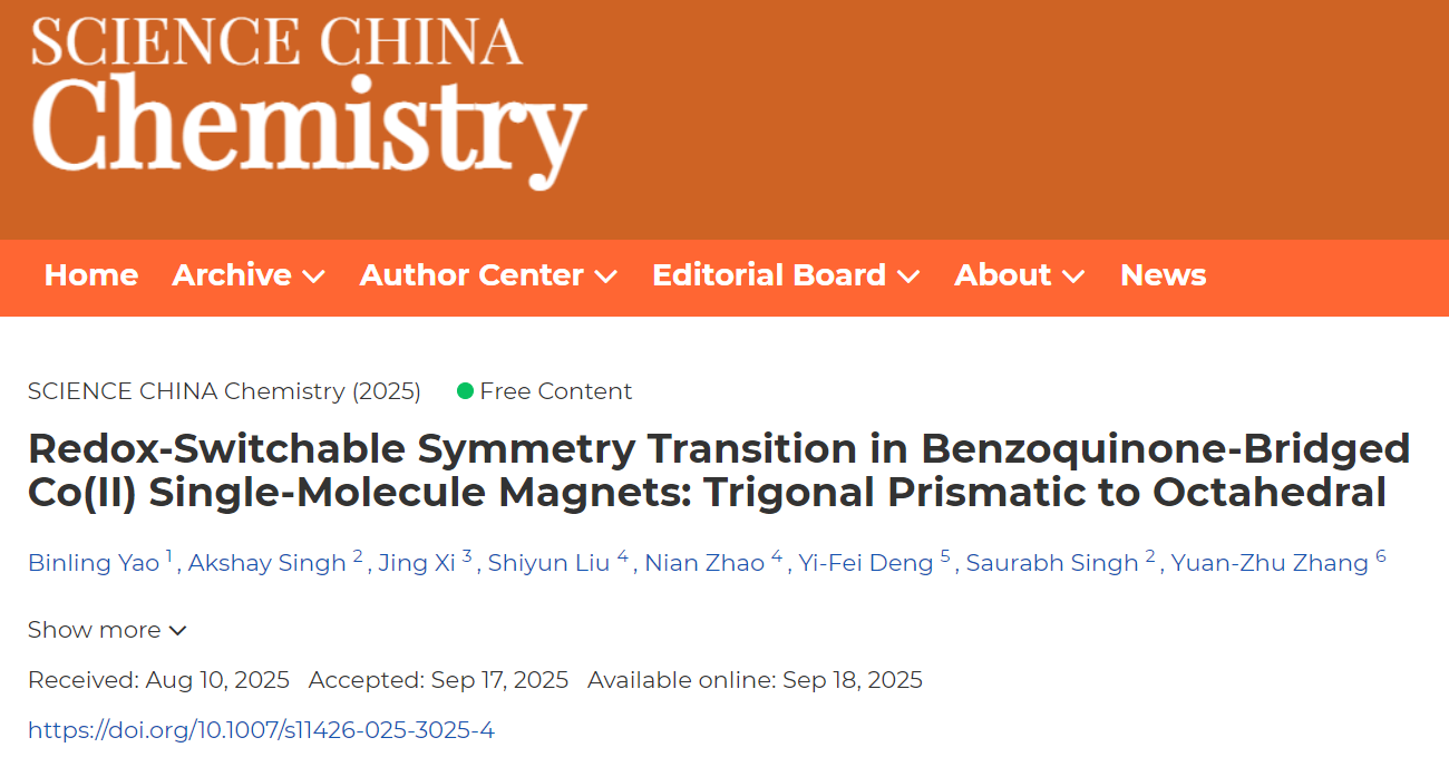 近日,国际知名期刊Science China Chemistry(《科学中国化学》)在线发表了无机化学教研室姚彬玲博士在分子纳米磁体领域的最新研究成果,论文题目为“Redox-Switchable Symmetry Transition in Benzoquinone-Bridged Co(II) Single-Molecule Magnets: Trigonal Prismatic to Octahedral”(《苯醌桥连钴(II)单分子磁体的氧化还原调控对称性转变:三棱柱构型向八面体构型的转换》)。姚彬玲博士为论文第一作者和通讯作者,南方科技大学张元竹教授、印度海得拉巴理工学院Saurabh Singh教授为论文共同通讯作者,williamhill官网为论文第一通讯单位,Science China Chemistry是Science Press出版社旗下的化学领域期刊,SCI中科院一区TOP期刊,最新影响因子为9.7。