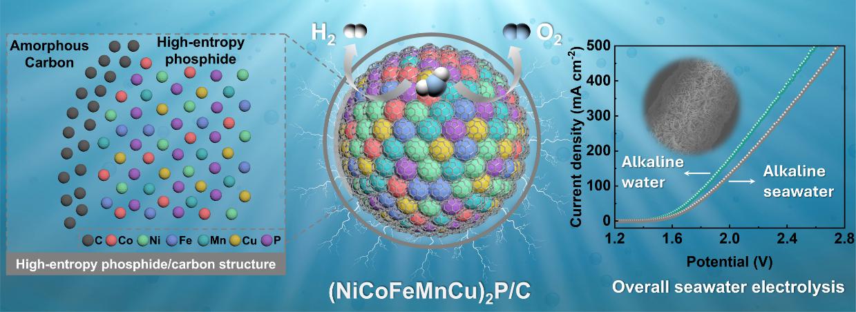 海水电解被视为一种有望替代淡水电解、实现大规模可持续清洁制氢的路径。然而,传统电催化剂材料在高盐度环境中(主要由于侵蚀性氯离子的存在)常常遭受严重腐蚀和性能衰减。此外,还需避免氯离子诱导的竞争性阳极析氯反应,因为该反应会导致电解效率降低。高熵材料的应用为这些挑战提供了潜在的解决方案。其独特的组分复杂性赋予高熵材料卓越的特性,包括显著增强的耐腐蚀性和催化活性,使其在海水电解过程中展现出优异的稳定性和效率。该工作中,以金属有机框架为前驱体,作者在泡沫镍基底上原位制备了一种具有三维结构的高熵NiCoFeMnCu磷化物/碳复合材料,用于实现高活性和高稳定性的海水分解。结果表明,在10 mA·cm-2电流密度下,该材料在碱性淡水和碱性海水中分别实现了88/195 mV(HER/OER)和100/223 mV的低过电位,展现了其卓越的双功能性能。此外,由该材料组装的简易双电极电解槽在工业级电流密度(1 A·cm-2)下连续稳定运行480小时未出现明显活性衰减,且测试后碱性海水电解液中几乎未检测到次氯酸盐,证实了其优异的耐氯腐蚀性和高选择性。因此,该高熵磷化物/碳电催化剂有望成为适用于全海水分解的高性能双功能电催化剂。