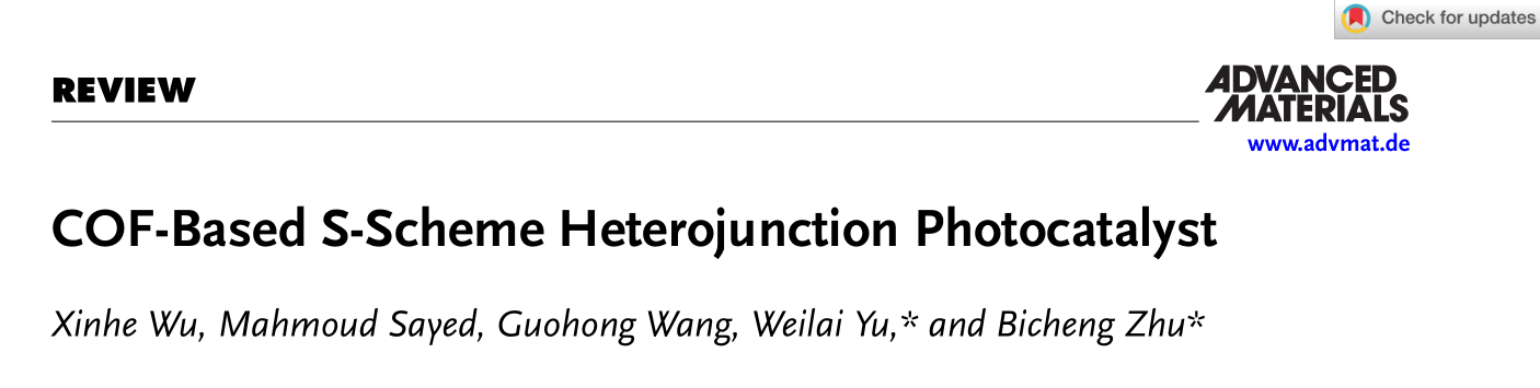 9月,Advanced Materials(《先进材料》)在线发表该团队最新综述成果,论文题为“COF-based S-scheme heterojunction photocatalyst”(《COF基S型异质结光催化剂》)。吴新鹤副教授为论文第一作者,williamhill官网王国宏教授为论文共同作者,中国地质大学(武汉)朱必成教授和加拿大多伦多大学余维来教授为论文通讯作者,williamhill官网为论文第一通讯单位。Advanced Materials是Wiely出版社旗下材料科学领域顶尖期刊、中科院SCI材料科学大类一区TOP期刊、自然指数期刊,最新影响因子为26.8。