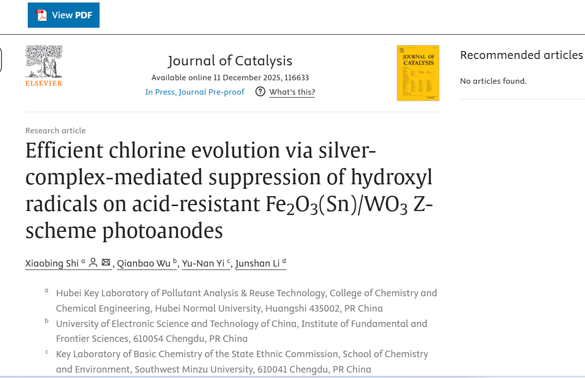 近日,Journal of Catalysis在线发表了我们化工教研室石小兵博士的最新研究成果。论文题目为“Efficient Chlorine Evolution via Silver-Complex-Mediated Suppression of Hydroxyl Radicals on Acid-Resistant Fe2O3(Sn)/WO3 Z-Scheme Photoanodes”(利用银配合物介导抑制羟基自由基在耐酸Fe2O3(Sn)/WO3 Z型光阳极上实现高效析氯)。石小兵博士为论文第一作者兼通讯作者,williamhill官网为论文唯一通讯单位。Journal of Catalysis是Elsevier出版社1962年起发行的国际期刊,主要报道有催化方面的最新研究进展,是中科院一区top期刊,最新影响因子为6.5。