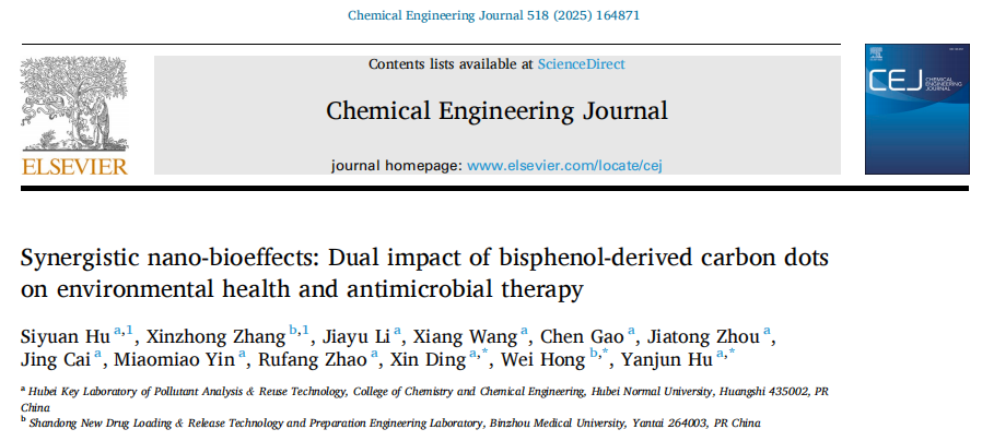[成果15] 胡艳军/丁鑫:协同纳米生物效应:双酚衍生碳点对环境健康和抗菌疗法的双重影响