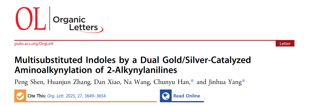 多取代吲哚是一类重要的结构单元。常规的合成方法存在明显局限性:需预先合成无环中间体或区域选择性控制等难题。该研究报道了一种高效的多取代吲哚合成新策略:在空气氛围下,通过双金/银催化体系的高价碘(III)试剂对2-取代苯胺类化合物的氨基炔基化反应。