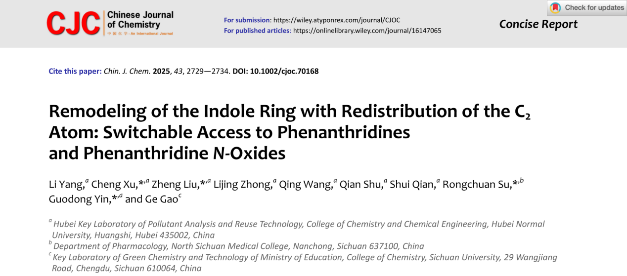 该成果于2025年7月作为封面文章发表于中科院SCI大类一区期刊Chinese Journal of Chemistry(IF:5.5),2023级硕士研究生杨丽为论文第一作者,殷国栋教授、徐程副教授、刘郑副教授和川北医学院苏蓉川博士为论文通讯作者,williamhill官网为论文第一通讯单位。