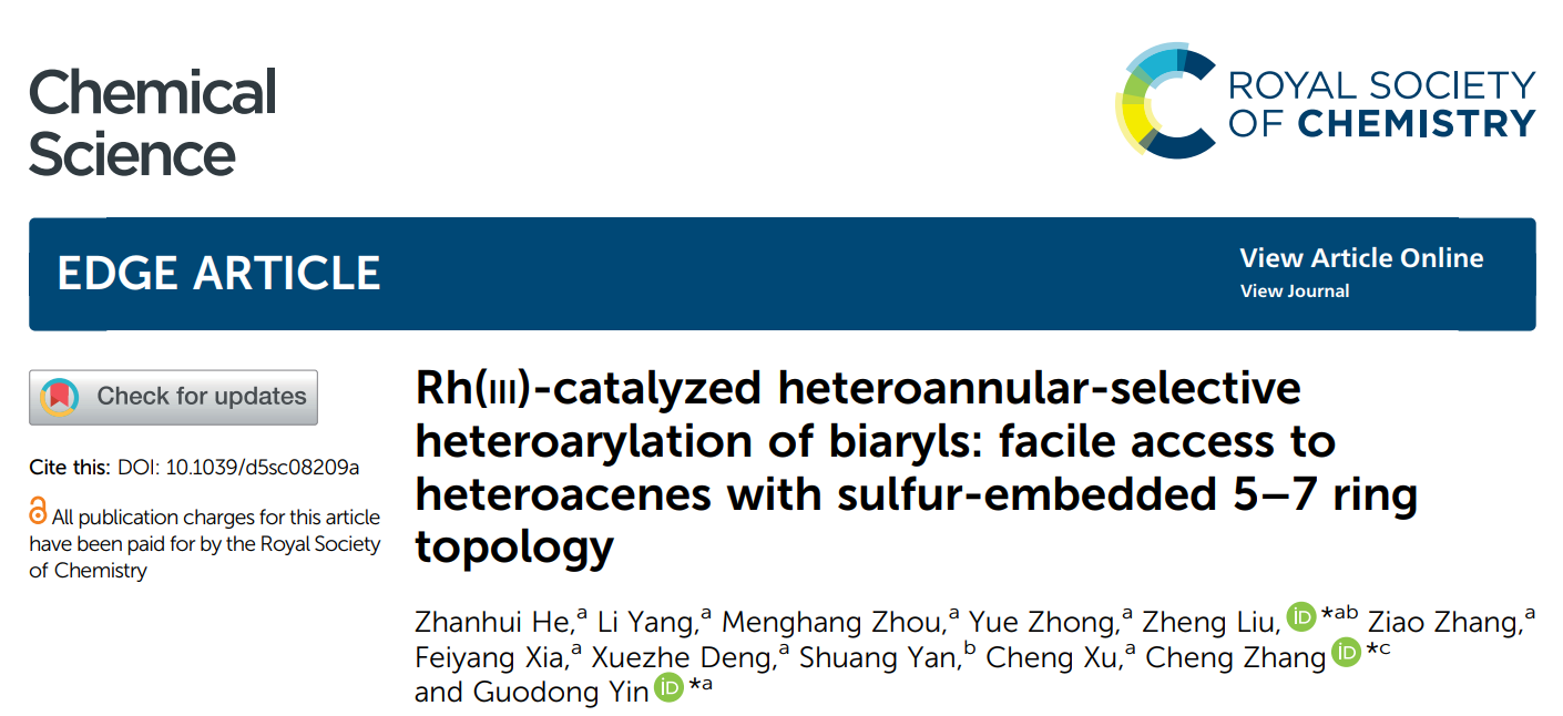今年元月,Chemical Science(《化学科学》)在线发表该团队题为“Rh(III)-Catalyzed heteroannular-selective heteroarylation of biaryls: facile access to heteroacenes with sulfur-embedded 5-7 ring topology”(铑(III)催化联芳烃异环选择性杂芳基化反应:快速构筑具有硫原子嵌入5-7环拓扑结构的稠环芳烃)的研究论文。我们2023级硕士研究生何展辉为论文第一作者,殷国栋教授、刘郑副教授和四川大学张程研究员为通讯作者,williamhill官网为第一通讯单位。Chemical Science是2010年由Royal Society of Chemistry(英国皇家化学会)出版社发行的化学领域综合性期刊,是中科院一区TOP期刊、自然指数(Nature Index)期刊,最新影响因子为7.5。