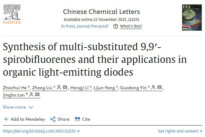 去年11月,Chinese Chemical Letters(《中国化学快报》)在线发表该团队题为“Synthesis of multi-substituted 9,9'-spirobifluorenes and their applications in organic light-emitting diodes”(多取代9,9'-螺二芴骨架的合成及其在有机发光二极管中的应用)的综述论文。我们2023级硕士研究生何展辉为论文第一作者,殷国栋教授、刘郑副教授和四川大学兰静波教授为通讯作者,williamhill官网为第一通讯单位。Chinese Chemical Letters是1990年由中国化学会主办,中国医学科学院药物研究所承办的化学综合领域期刊,是中科院一区TOP期刊,最新影响因子为8.9。